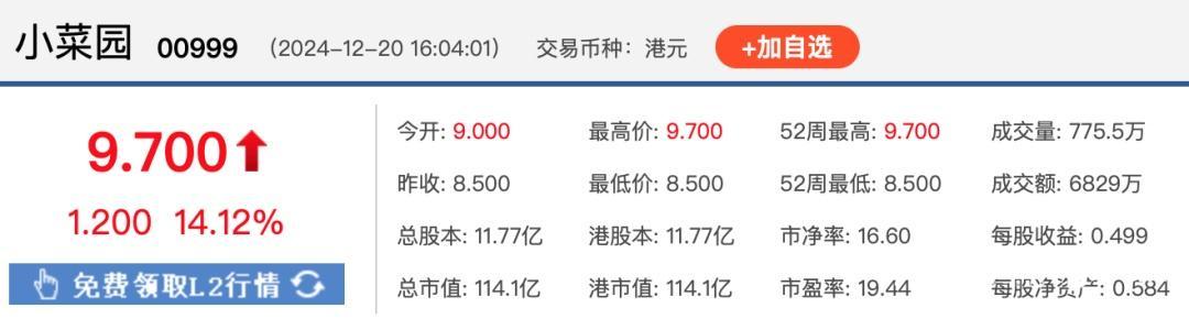 12月20日,新徽菜连锁品牌小菜园(00999.HK)崇敬登陆港股,小菜园的发售价为8.50港元,刊行约1.01亿股,召募资金8.60亿港元。上市首日,小菜园开盘股价就拉升了8.35%,盘中涨幅在4%凹凸浮动,附进收盘,股价急速拉升,抑制收盘,报9.70港元,飞腾14.12%,市值为114亿港元。