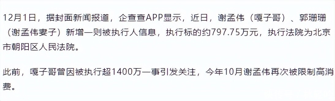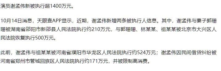 早在上月,已有媒体报说念称,谢孟伟因债务问题被法院列为被践诺东说念主。