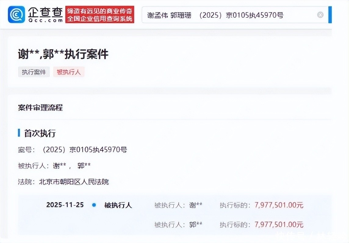 12月1日,中国践诺信息公开网骄气,谢孟伟与爱妻郭珊珊新增一条被践诺信息。