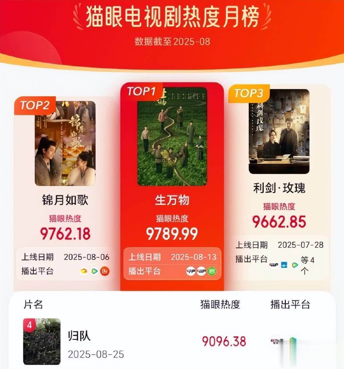 猫眼专科版2025年8月猫眼电视剧热度榜名次来了,杨幂、欧豪领衔主演的《生万物》成为冠军;周也、丞磊领衔主演的《锦月如歌》排第二,成为亚军;迪丽热巴、金世佳领衔主演的《利剑玫瑰》位列第三,成为季军,《归队》位列第四开yun体育网,你们可爱哪部剧?