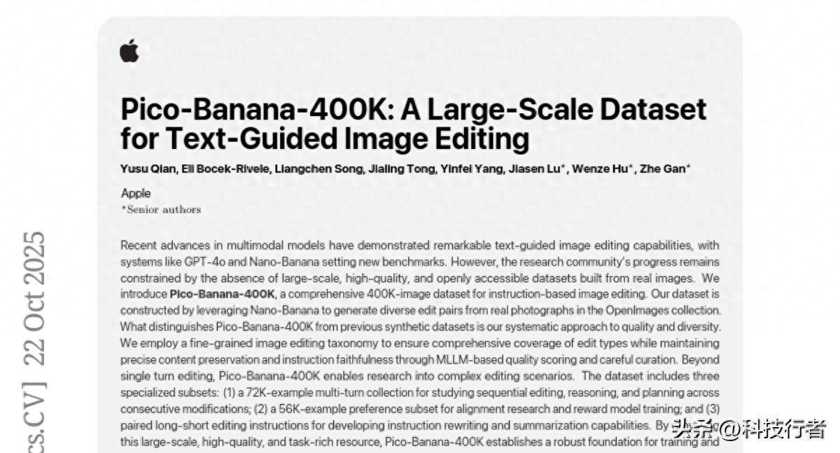 A:Pico-Banana-400K是苹果公司发布的AI修图查考数据集,包含近40万张图片的修改案例。每张图片齐配有修改提醒和扫尾,涵盖35种不同类型的修图操作,检朴单的颜料调理到复杂的立场交流,比如把夏天像片酿成冬景或把真东说念主酿成卡通立场。