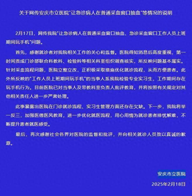 2月17日,网传我院“让急诊病东说念主在平素采血窗口抽血、急诊采血窗口使命主说念主员上班时期玩手机”问题。