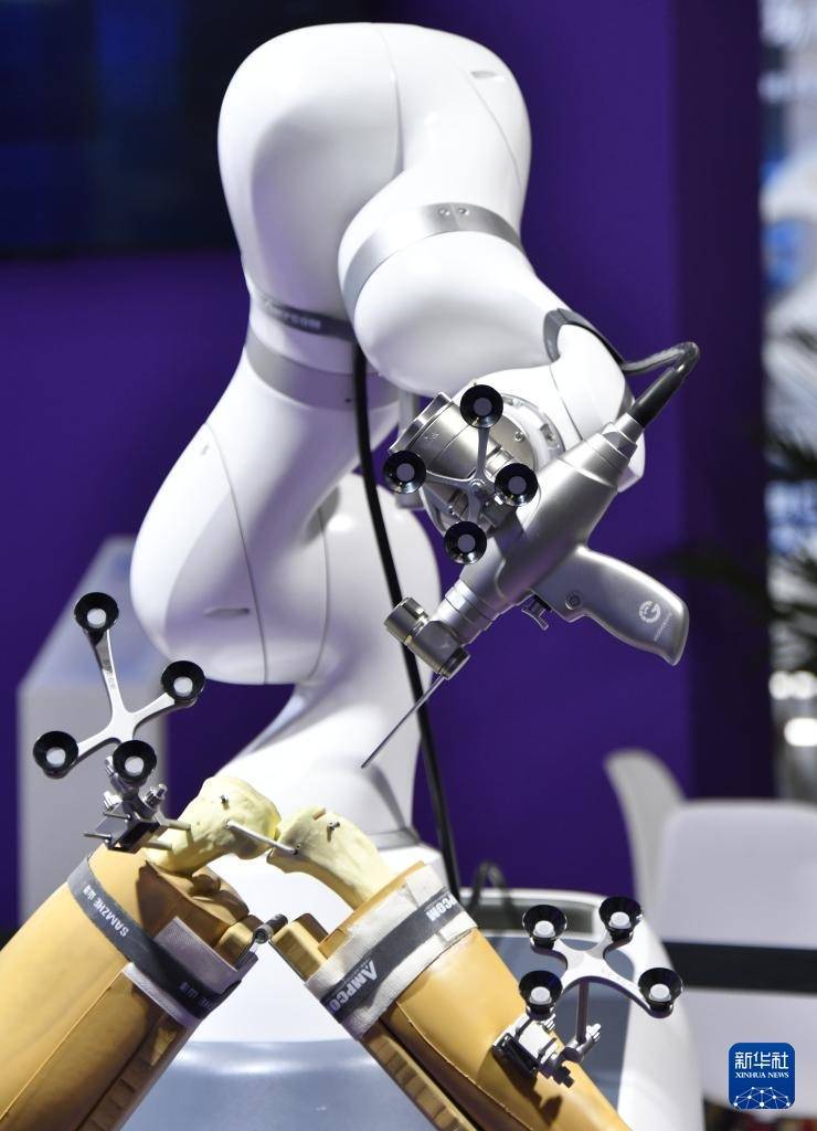 这是5月8日在第二十七届中国北京外洋科技产业展览会拍摄的骨科智高东说念主术机器东说念主。