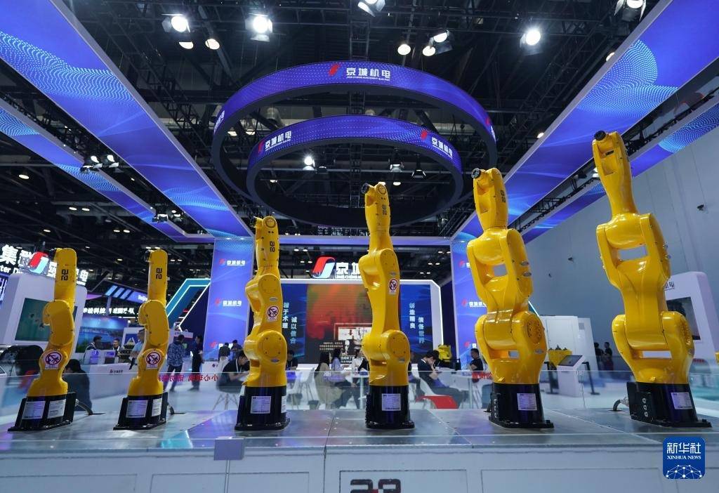 这是5月8日在第二十七届中国北京外洋科技产业展览会拍摄的工业机器东说念主。