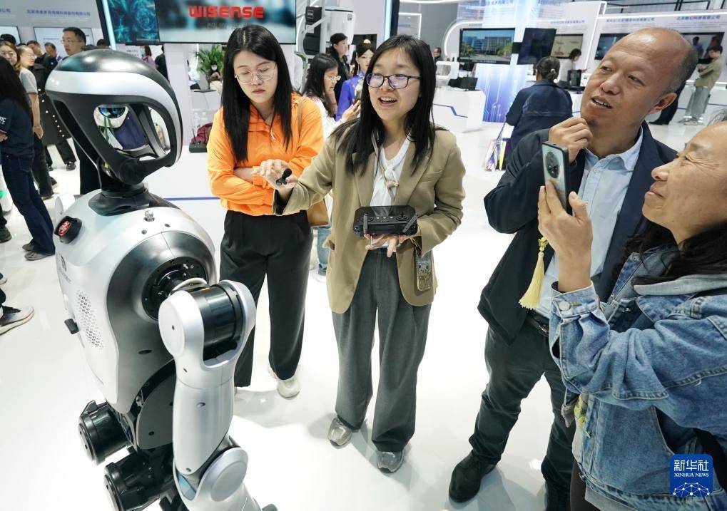 5月8日,机器东说念主在第二十七届中国北京外洋科技产业展览会大兴展台向不雅众挥手问候。