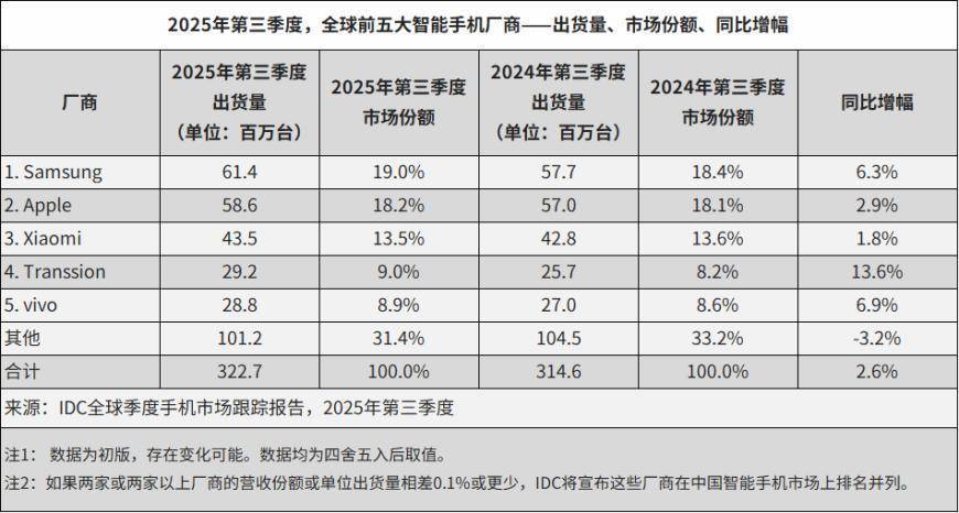 IDC最新季度手机追踪初步数据贯通体育游戏app平台,2025 年第三季度,巨匠智高手机出货量达 3.227 亿部,同比增长 2.6%。在高端市集的带动下,智高手机市集陆续复苏态势:改动的外不雅蓄意与更具性价比的 AI 智高手机诱导花费者升级诱导,成为市集增长的要道能源。