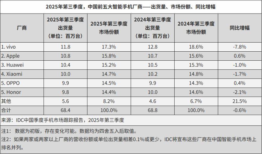 2025年第三季度中国前五大智高手机厂商市集发扬:
